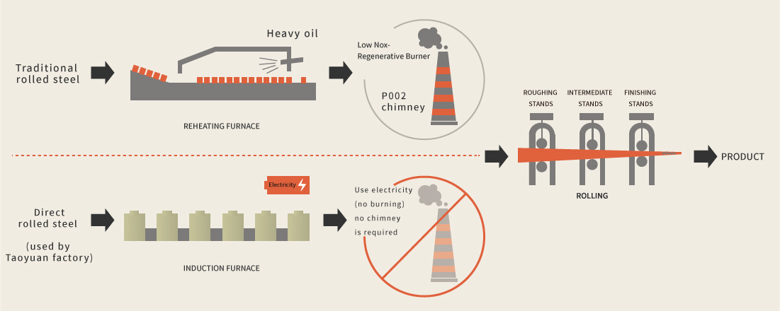 In order to reduce pollution emissions, Tung Ho Steel’s steel-rolling production line utilizes advanced burning equipment. A portion of production processes have changed over to natural gas in place of low-sulfur fuel oil, which has significantly reduced CO2, NOX and SOX pollutant emissions. The production process at the newly planned and completed Taoyuan Works employs direct rolling and extension of steel and does not feature heat furnaces. Compared to traditional steel-rolling, which uses fuel oil to heat the product and which can generate pollution, the new approach is more environmentally friendly.
