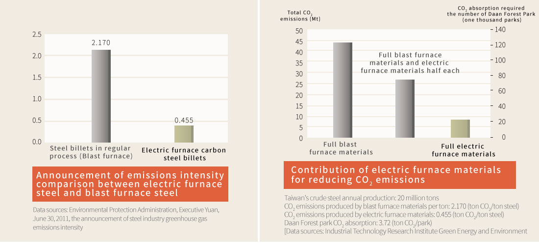 Steel protects the environment and is an eco-friendly industry! Steel refining using electric furnaces as employed by Tung Ho Steel primarily utilizes steel scrap as its major source material. Compared to blast furnace and converter furnaces, which use large quantities of iron ore and coal, our approach has the advantage of offering resource recycling and reuse. In addition, electric furnace steel refining generates 75% less CO2 compared to blast furnace refining. This is of positive significance to the reduction of greenhouse gas emissions and the protection of the environment.