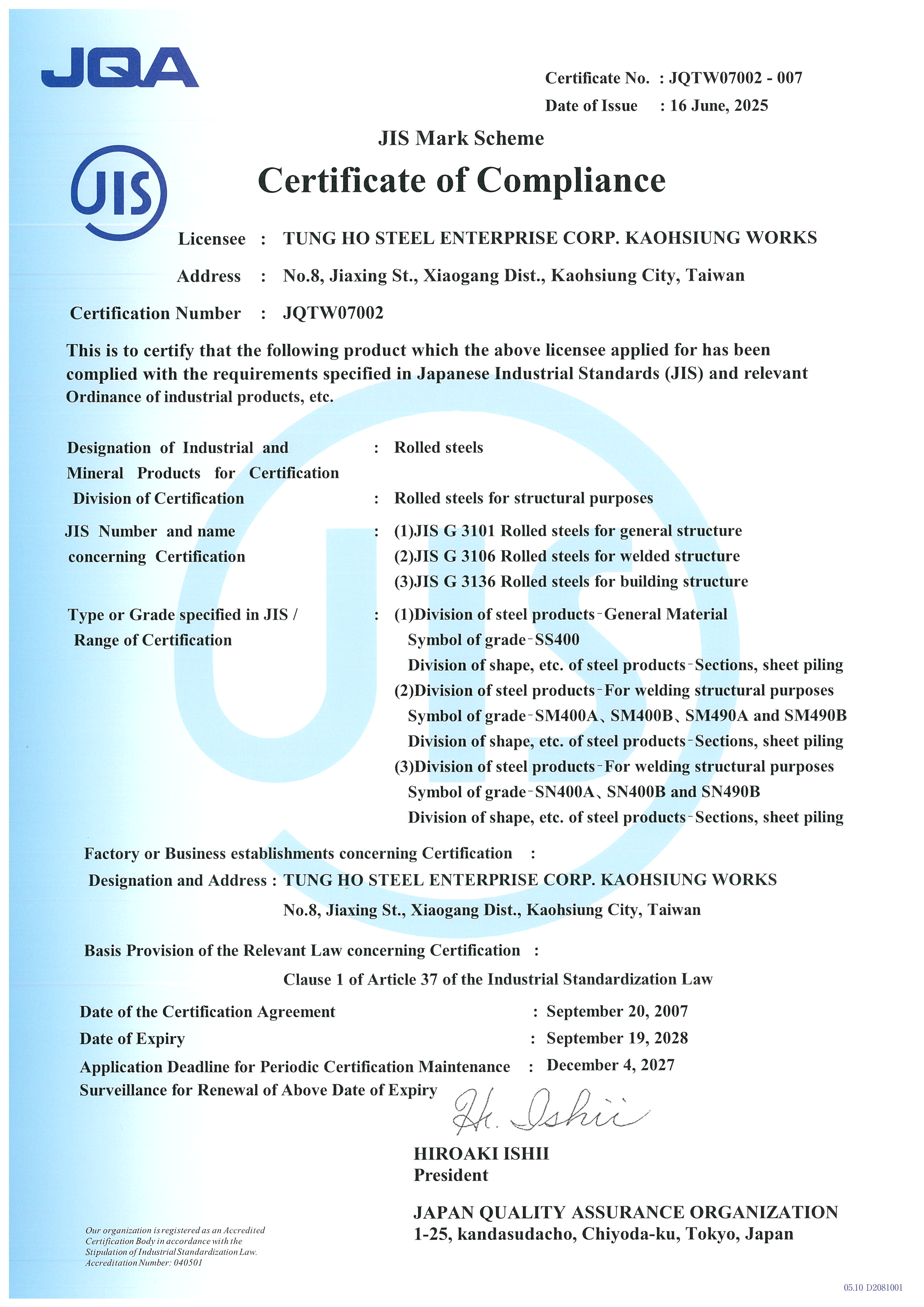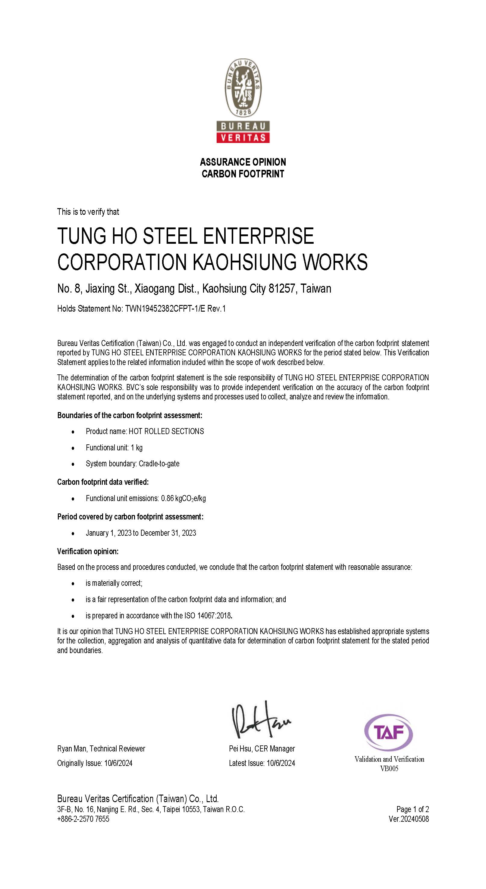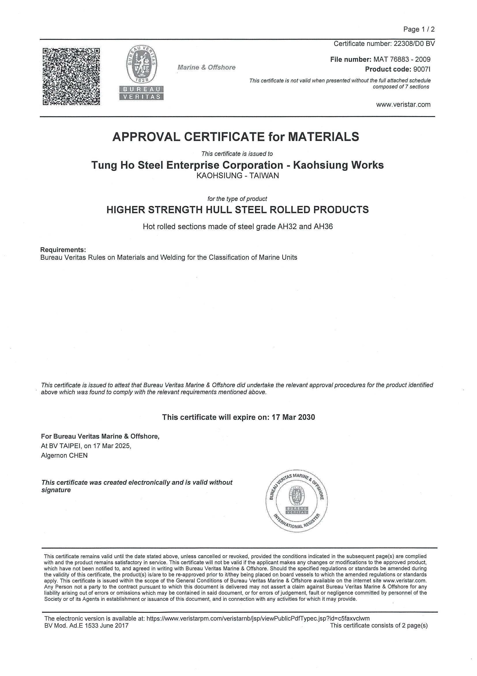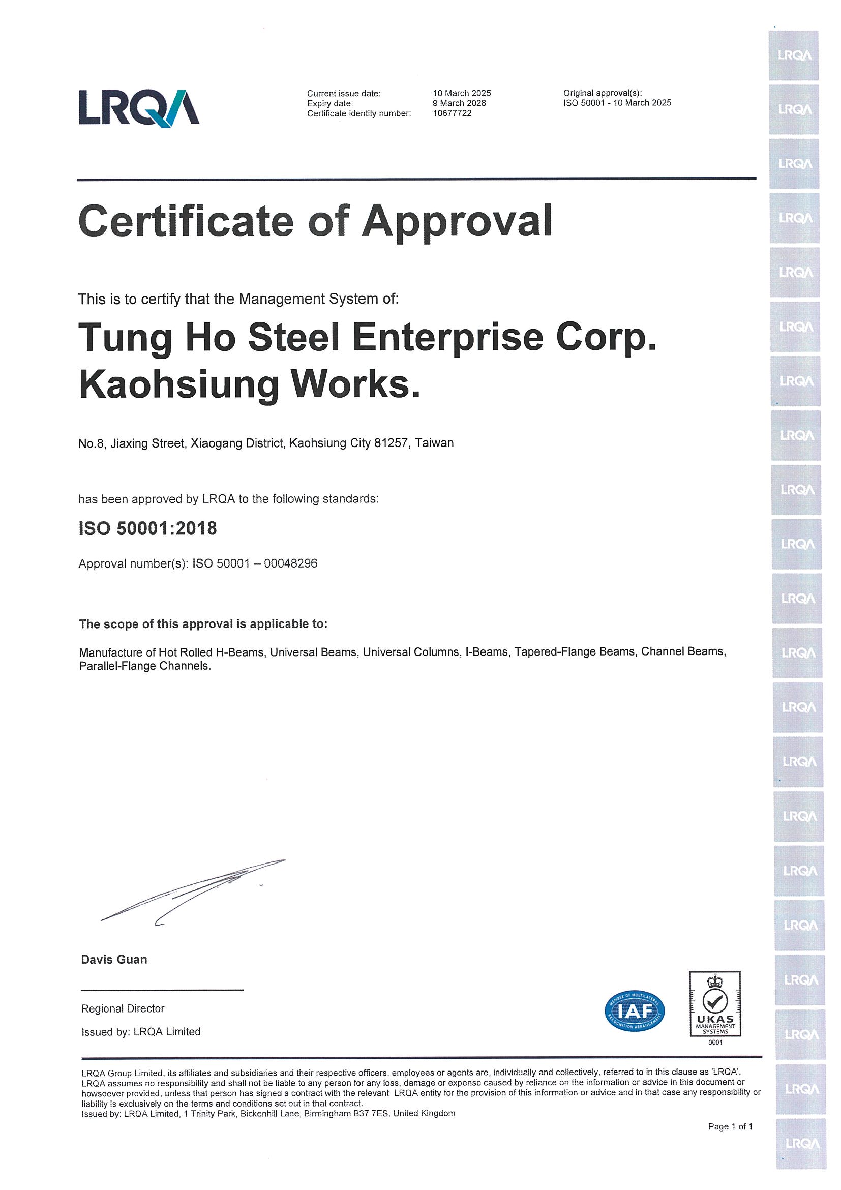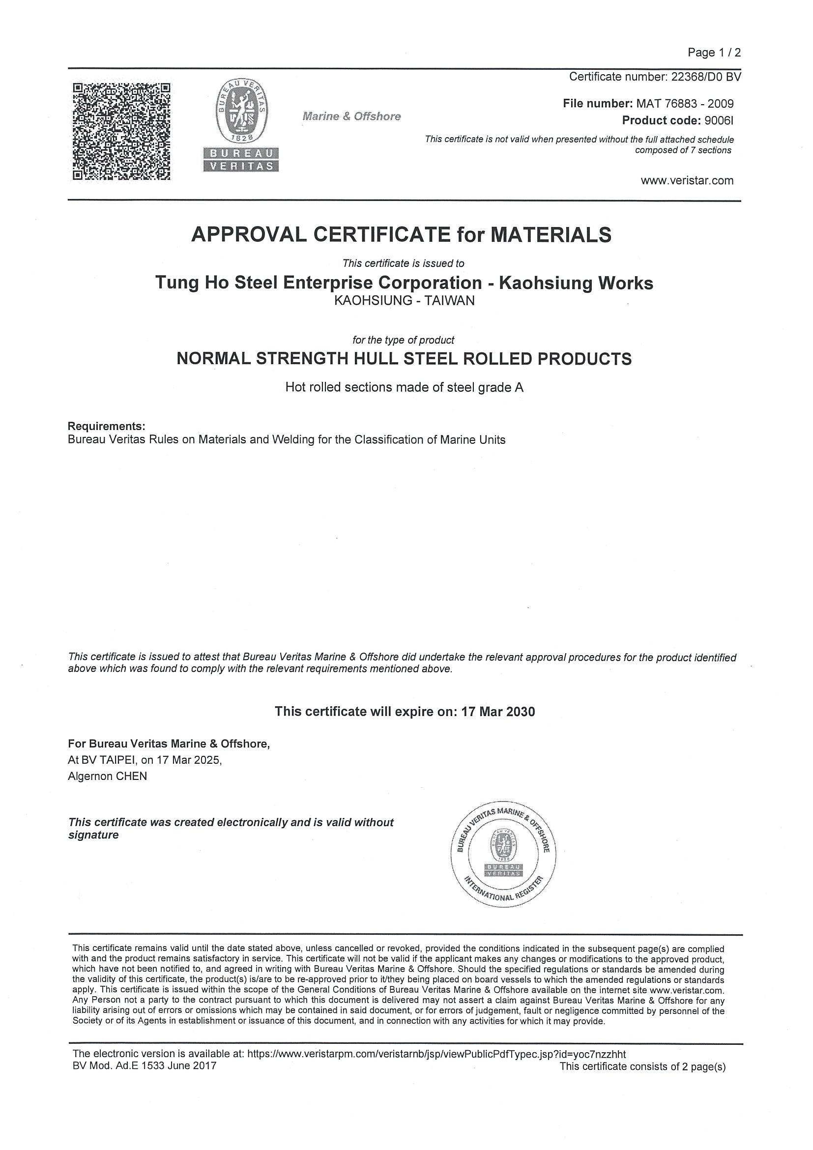 STEEL SUSTAINABILITY AUSTRALIA VERIFIED SUPPLIER CERTIFICATESSA Certificate of Compliance - Tung Ho Steel Enterprise Corp. - Kaohsiung Works-2025(1).pdf -
