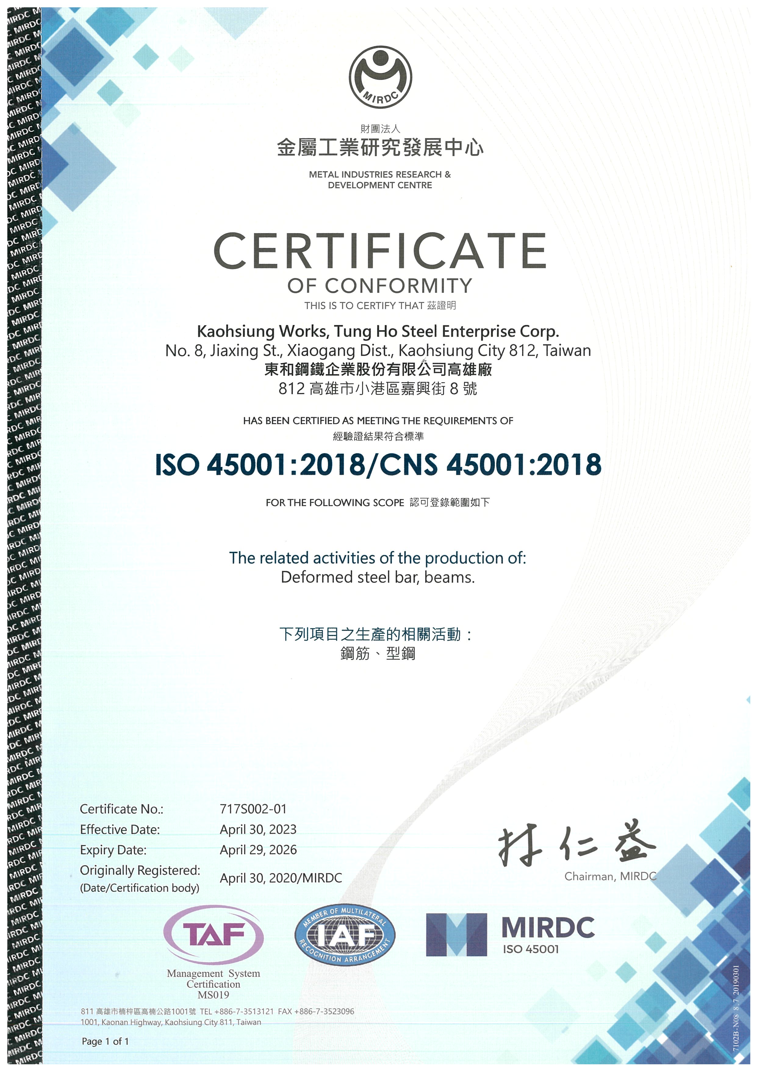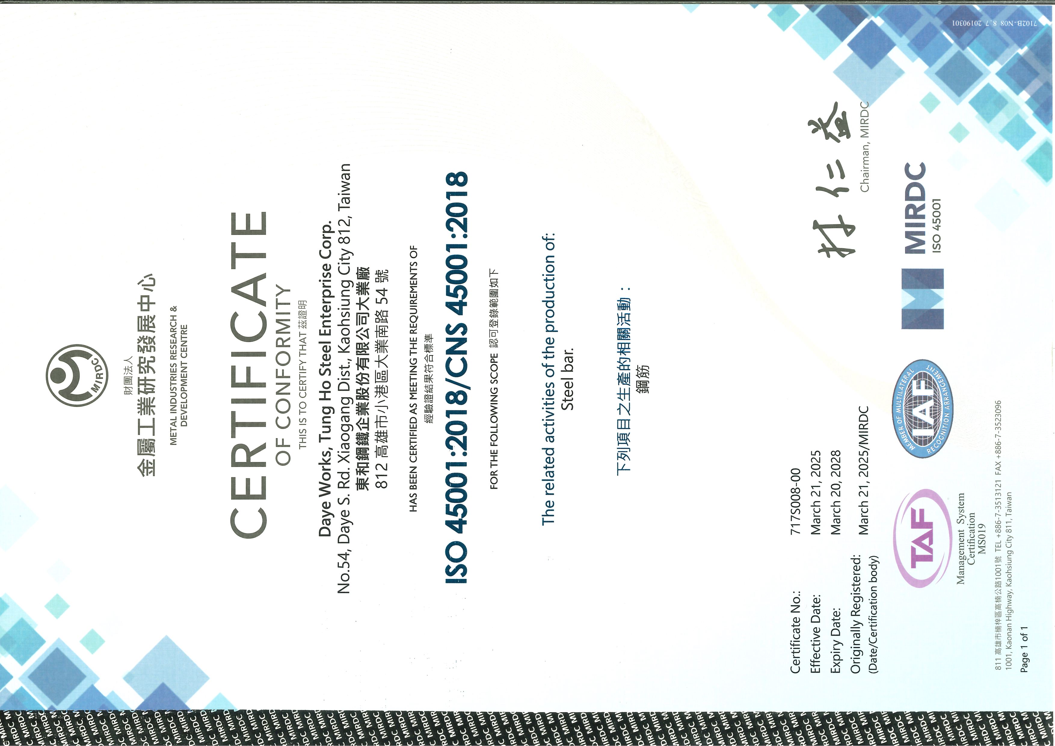 (ISO 45001 : 2018) Occupational Health and Safety Management systems (DAYE FIELD)東和鋼鐵大業廠-ISO45001_2018(證號_717S008-00)(1).pdf -