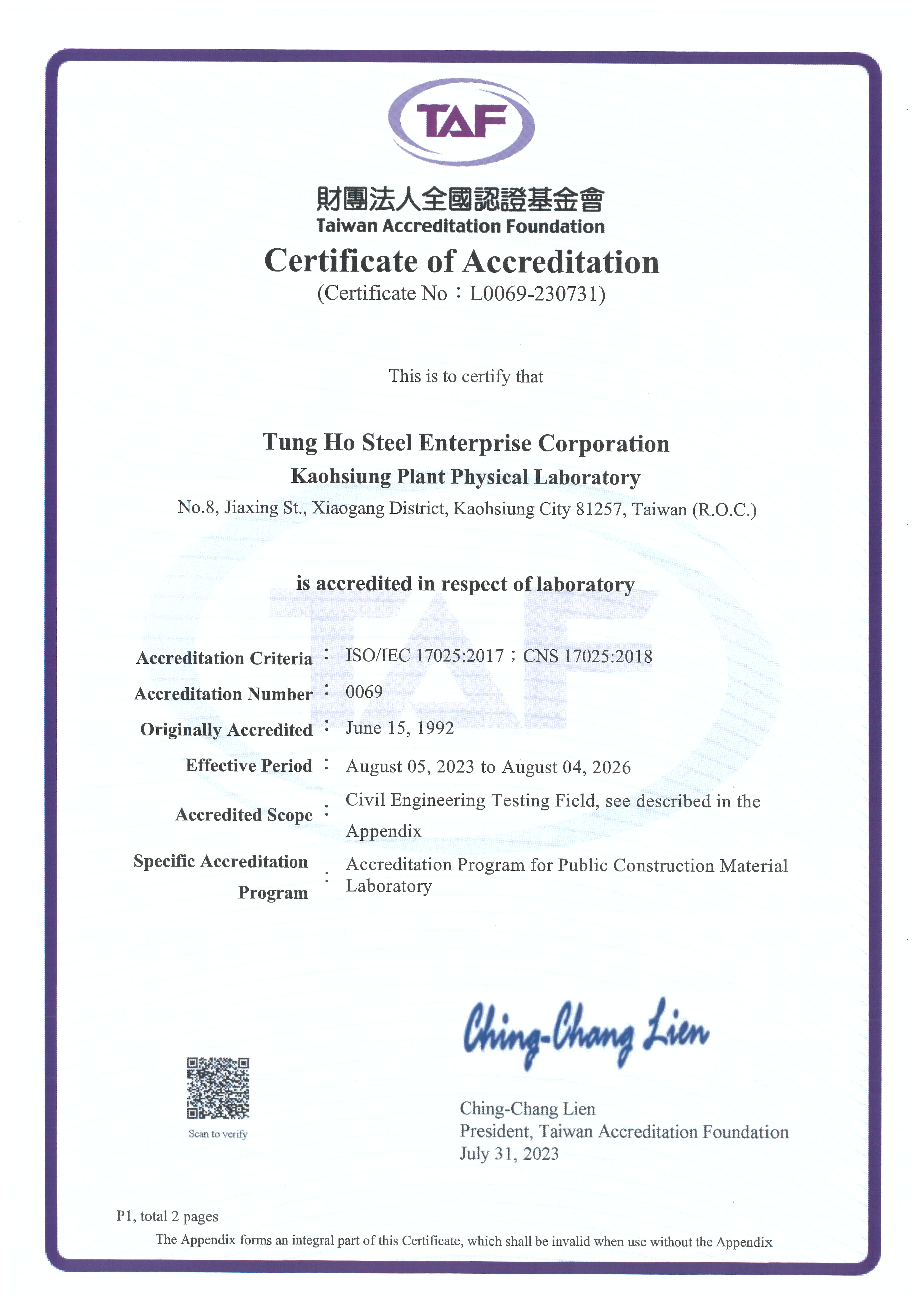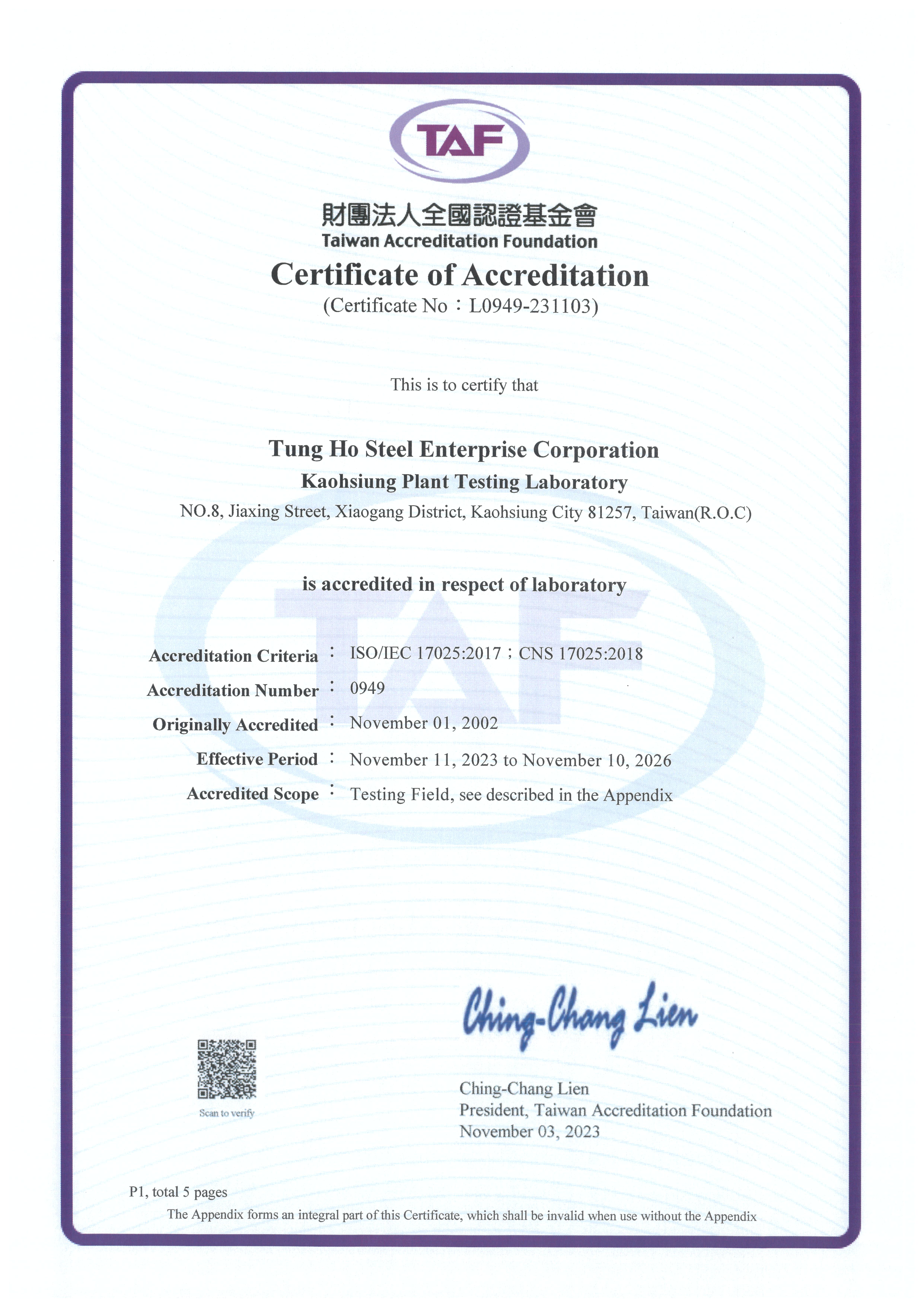 (TAF) Chemical lab certified with Taiwan Accreditation Foundation測試實驗室(原化學實驗室) 2026.11.10 到期(英).pdf -