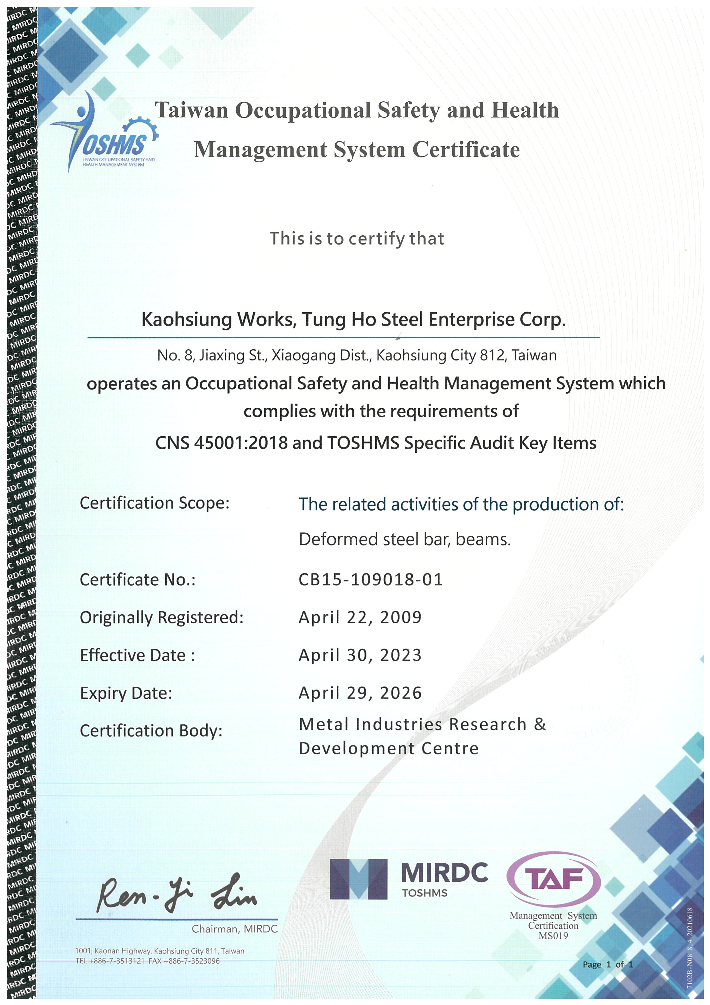 (TOSHMS) Taiwan Occupational Safety and Health Management System台灣職業安全衛生管理系統:CNS2018英文版證書_1120430~1150429.pdf -