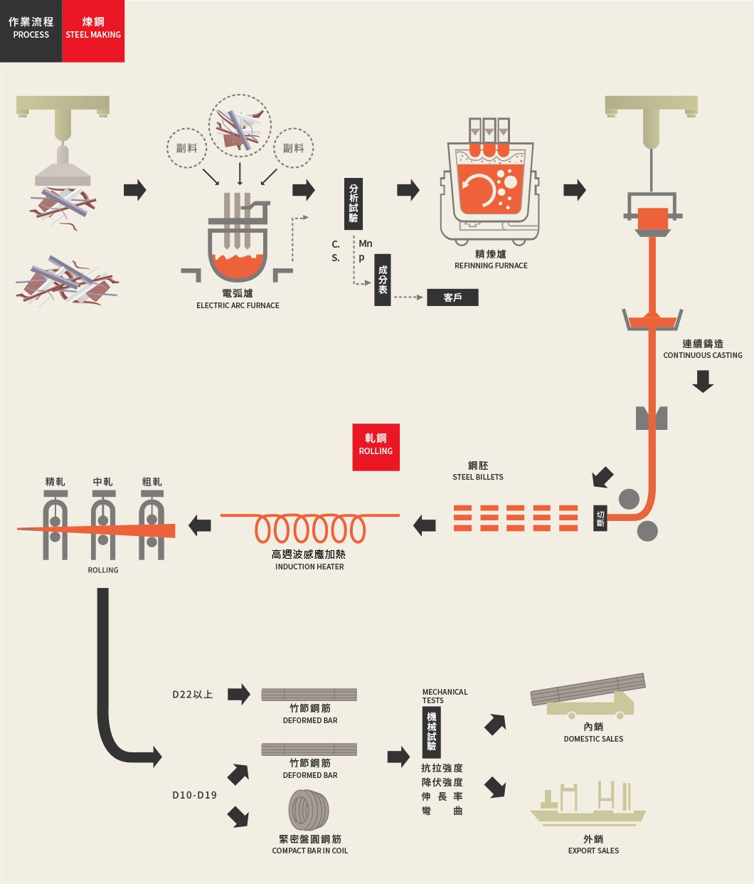 桃園廠透過煉、軋鋼產線最佳化的配置與設備性能的提升,並導入世界最先進之直接軋延製程,將原料到產出鋼筋成品之生產週期,由傳統3小時以上縮短至2小時內,大幅提升生產效率,為一節能環保與生產效率並重之專業鋼筋生產工廠。