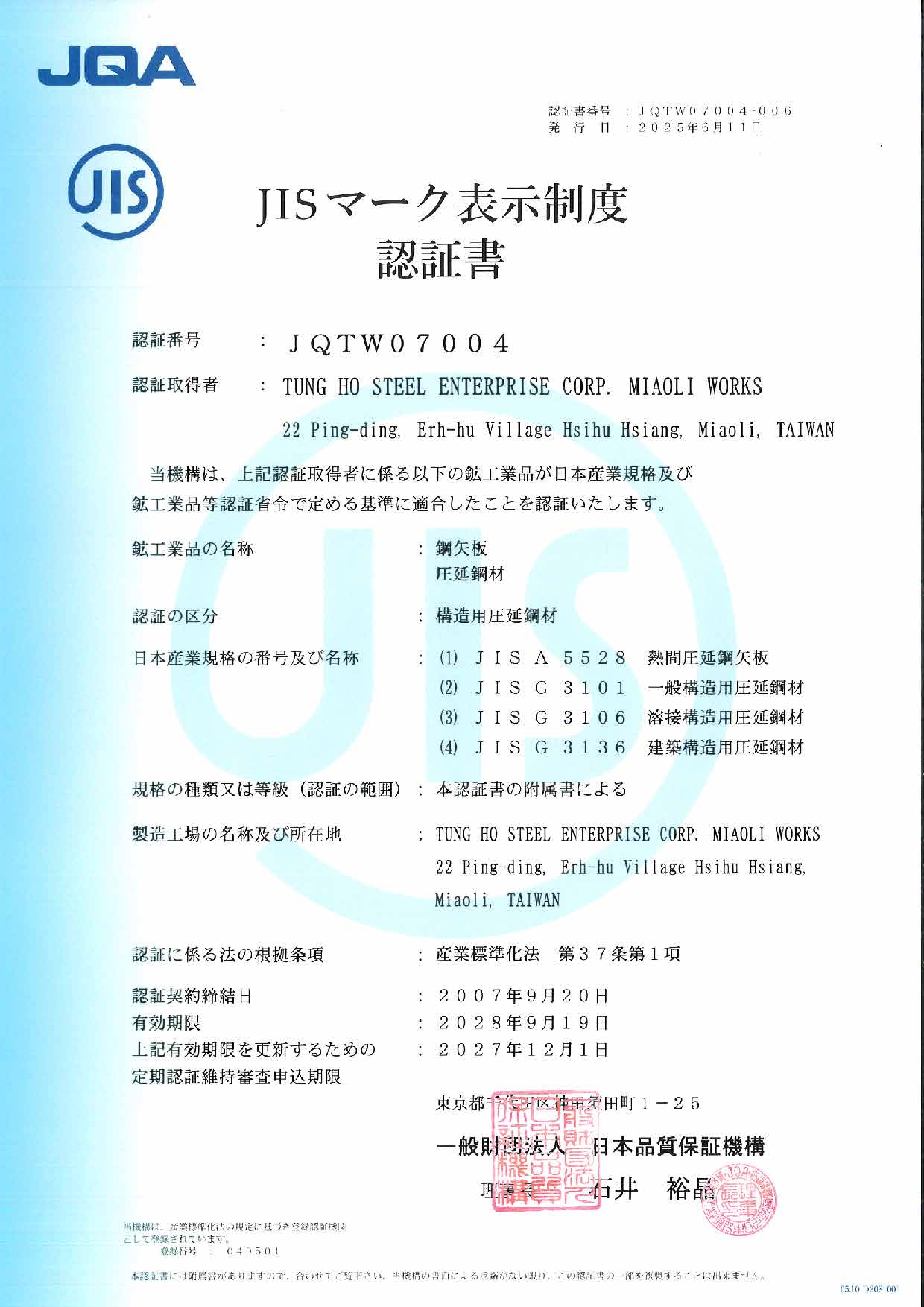 JIS mark 認證證書2025-2028年(日文版).pdf